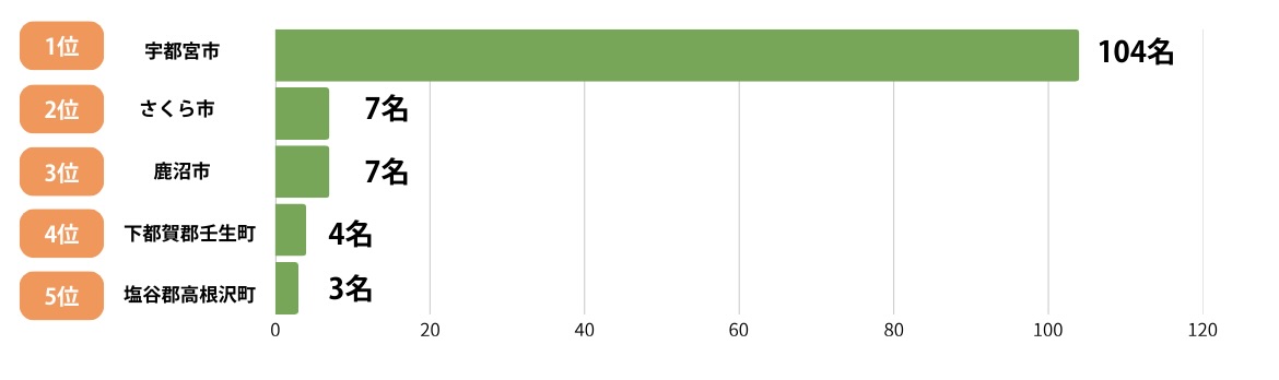 ・栃木県では「宇都宮市」が104名と圧倒的に多く、住宅検討エリアとして突出した人気を集めました。
